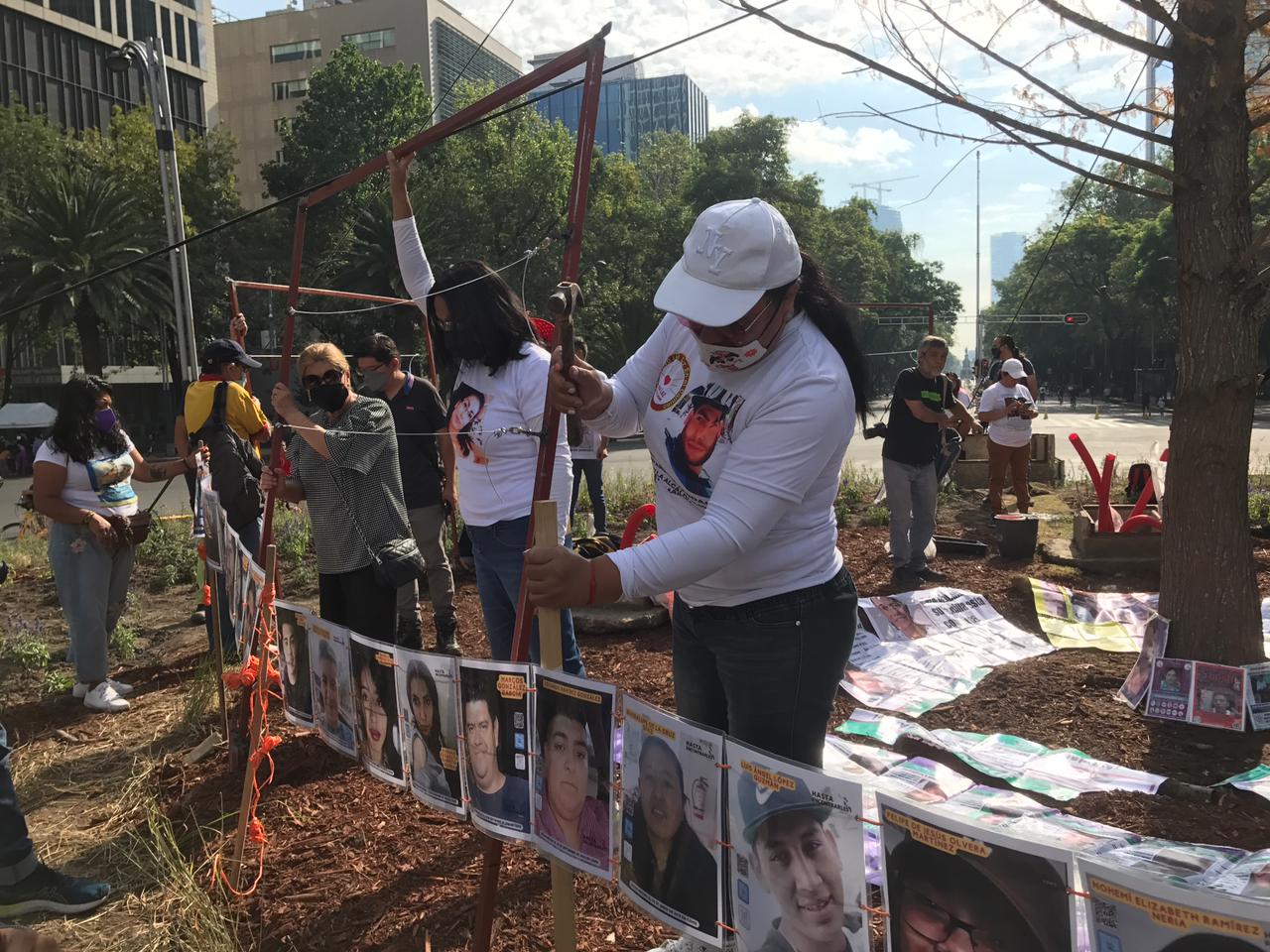 Familiares de personas desaparecidas colocan una cerca con las fotos de sus seres queridos en la exglorieta de la Palma